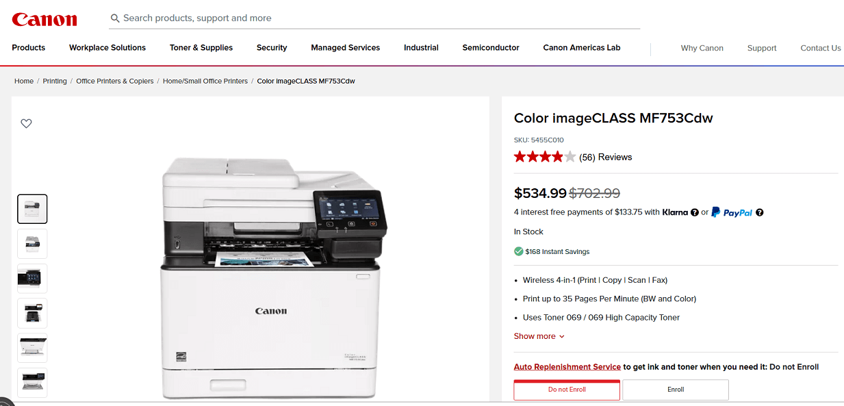 The Canon Color imageCLASS MF753Cdw is a color laser printer that combines print, copy, scan, and fax functions. With speeds up to 35 pages per minute and support for both Mac and Chromebook wireless printing, it’s built for offices or home users who need fast and consistent document handling.