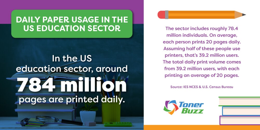 In our list, the Education Sector ranks first as the top user of paper for printing. With about 3.2 million teachers and 75.2 million students in US schools, totaling 78.4 million people, we can estimate that half of them use printing services in schools.