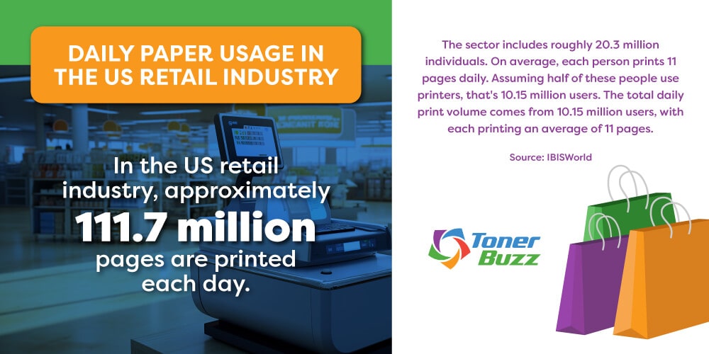 As of 2023, there are 20,325,461 people employed in the Retail Trade industry in the US. Considering only half of these employees and accounting for the average printing per user, the total daily number of pages printed in the Retail Trade industry is 111,7 million pages.