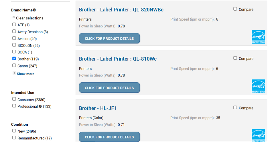 To find which Brother printers are 'Energy Star' certified, go to the Energy Star product finder. Then, in the 'Brand' section on the left sidebar, select 'Brother'. You'll see the list of Brother Energy Star certified printers.